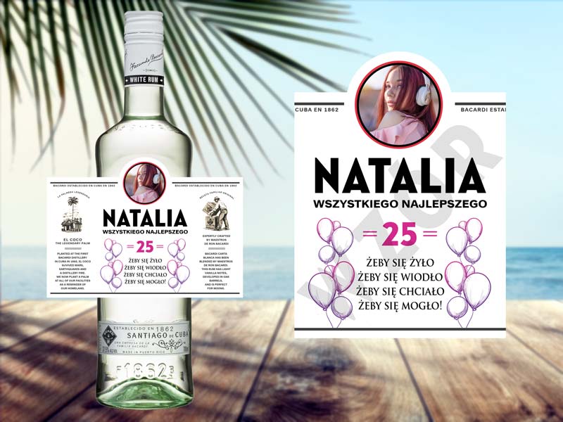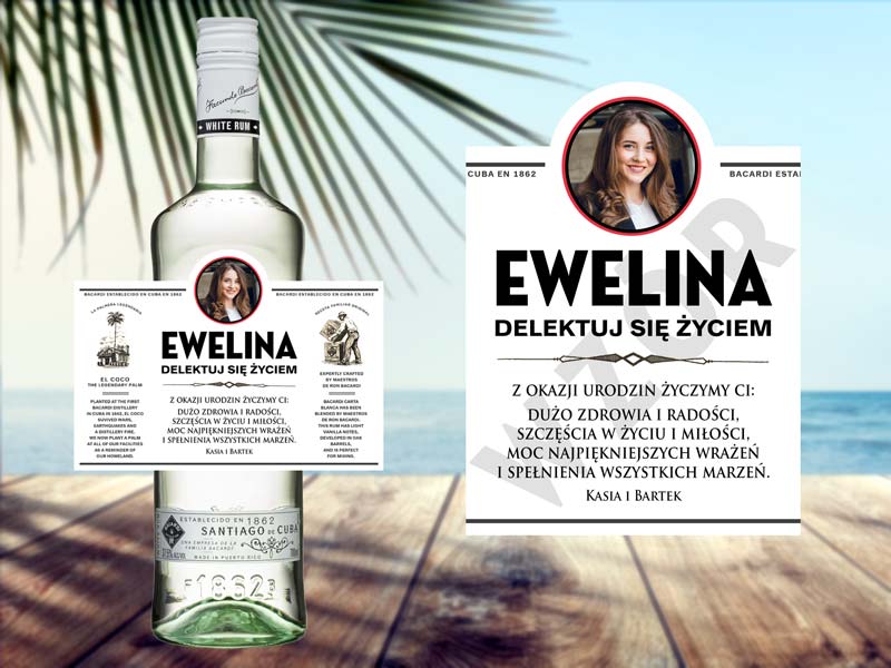 Butelka rumu Bacardi z personalizowaną etykietą to oryginalny prezent na każdą okazję. Personalizowana butelka Bacardi sprawi, że Twój prezent będzie niepowtarzalny. Możemy zaprojektować etykietę z okazji urodzin, imienin, ślubu, prośby o świadkowanie, podziękowania, rocznicy itd. A wszystko to według Twoich wytycznych, z Twoim zdjęciem oraz tekstem.