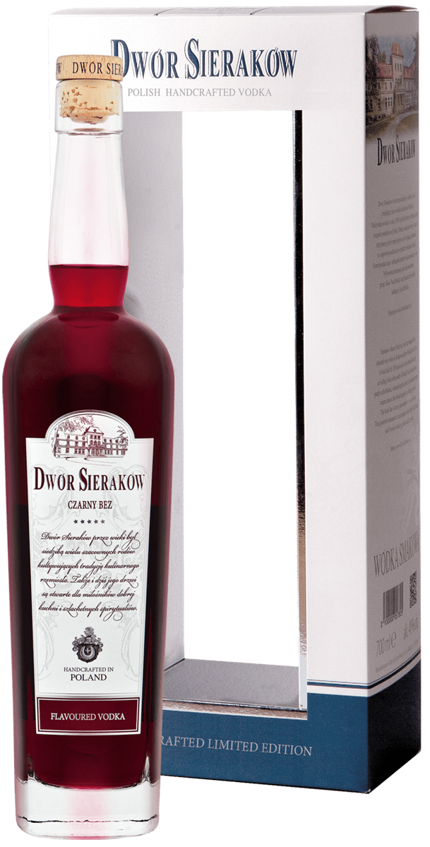 Dwór Sieraków Czarny Bez -to polska wódka rzemieślnicza tzn. tworzona w limitowanych ilości według unikalnej receptury ściśle powiązanych z historią dworu. Wódka jest sumą najwyższej jakości destylatów, maceratów i nalewów produkowanych według okrytych tajemnicą przepisów. Większość zadań w trakcie produkcji wykonuje się ręcznie co tylko potwierdza wyjątkowość wódki Dwór Sieraków. W smaku wyczuwalna słodycz, karmel i owoce lasu o lekko korzennym finiszu.