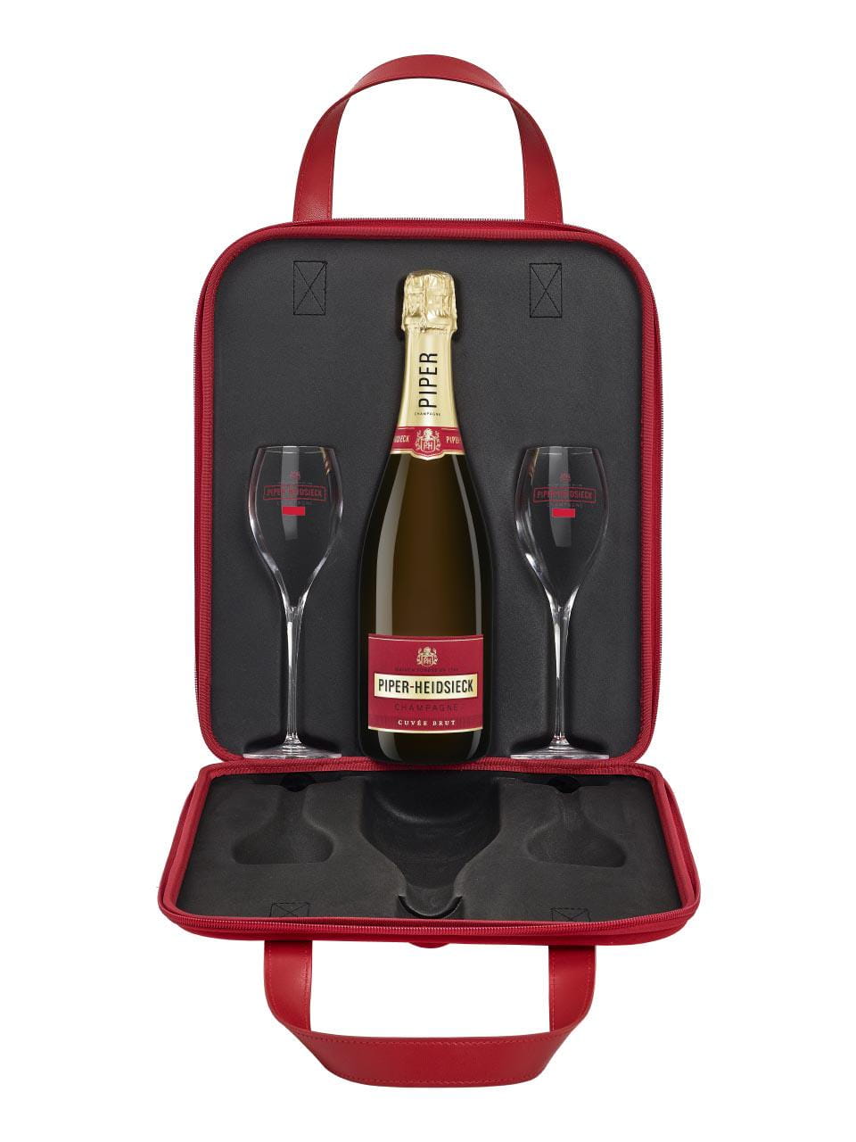 Torebka zawiera jedną butelkę szampana Piper Heidsieck 0,75L oraz 2 kieliszki.